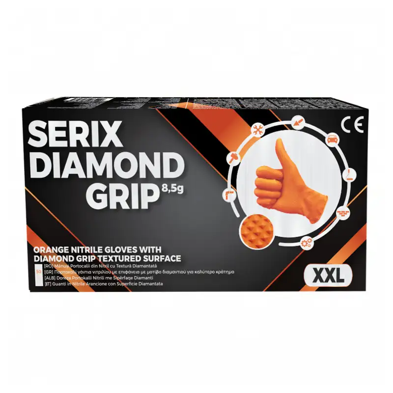 Τα SERIX+ 8,5g είναι γάντια νιτριλίου βαρέως τύπου, σχεδιασμένα για μέγιστη αντοχή και απόλυτη πρόσφυση σε απαιτητικές συνθήκες εργασίας. Η αντιολισθητική υφή τύπου “diamond grip” καλύπτει ολόκληρη την επιφάνεια του γαντιού, προσφέροντας ασφαλές κράτημα ακόμα και σε υγρά, λιπαρά ή ολισθηρά περιβάλλοντα.